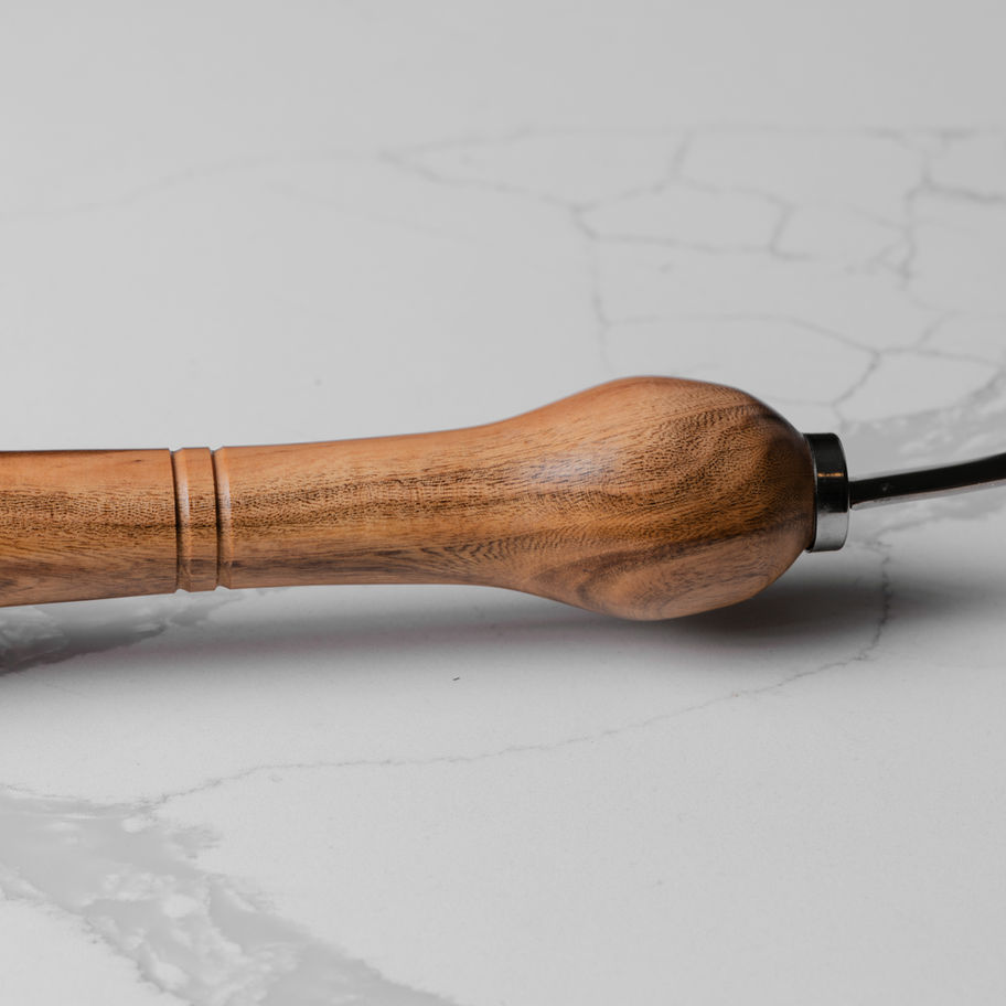We’ve applied that same intentionality to this piece. Hand-turned in our Salt Lake City studio from domestically harvested walnut, the handle features a series of architectural "steps" that echo the silhouette of trail markers while providing a natural, ergonomic grip. The deep, rich grain of the walnut is finished to a smooth texture, making it as much a tactile experience as a functional tool. Whether used for heavy stirring or delicate serving, the Cairn is designed to be the guide of your culinary landscape.